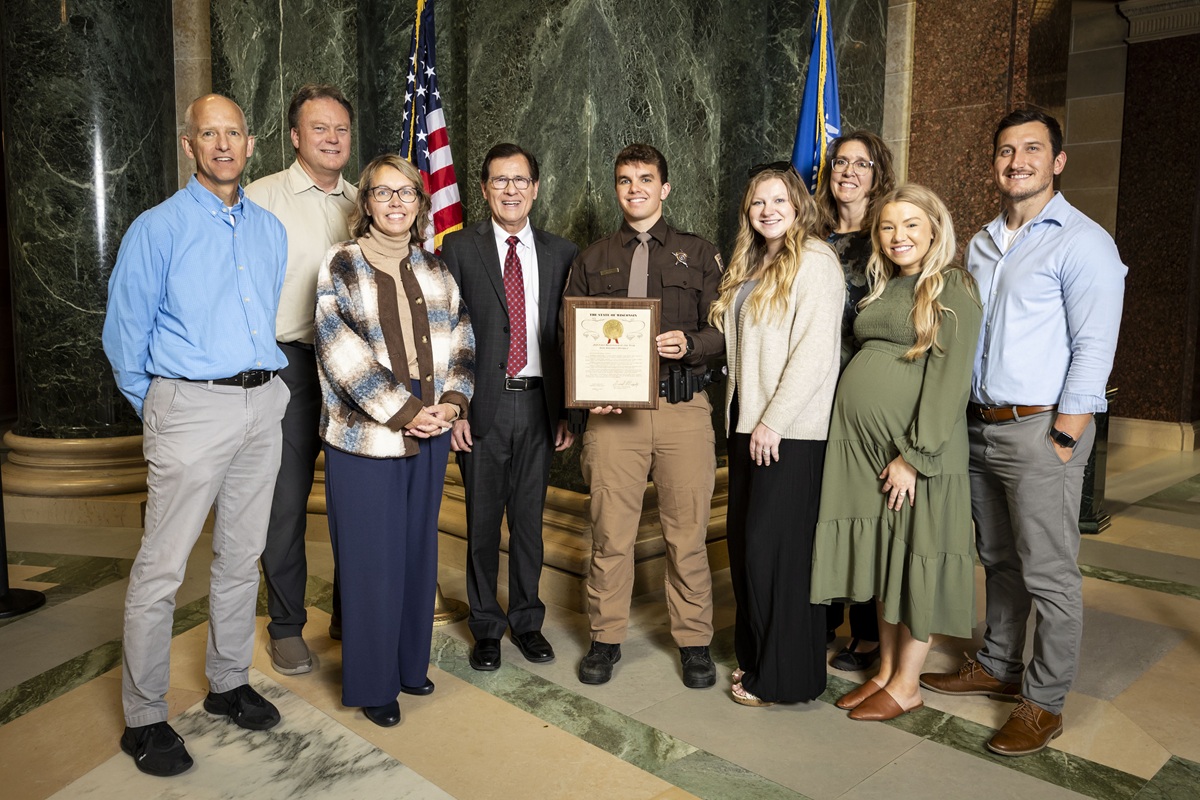 On Tuesday the Assembly honored First Responders from across the state. I was honored to nominate Deputy Zackary Potter of the Outagamie County Sheriff’s Department.  Deputy Potter and his family are pictured above. He responded to a tragic call in Osborn Township despite being off duty for the day, he rendered life saving measures and remained on the scene to gather crucial information. Deputy Potter embodies all the qualities that come to mind when one thinks of a First Responder: compassion, bravery, and selflessness, Outagamie County and Wisconsin as a whole –are better off because of his commitment. The list of recipients from this year included police officers, K9 officers, sheriff’s deputies, firefighters, and all levels of EMS personnel. Along with providing each award recipient with a legislative citation recognizing their achievement, the state Assembly also passed a resolution declaring October 14th as First Responders Appreciation Day.