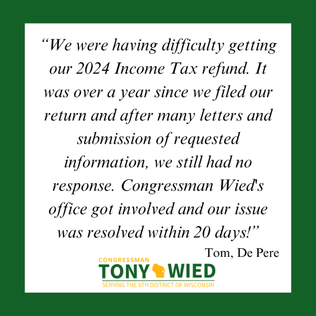 Providing the best constituent services to the people of the 8th Congressional District is a top priority for me, from Veterans Affairs (VA) to the Internal Revenue Service (IRS), my staff and I are here to help! To request assistance with a Federal Agency, you can contact my District Office at 920-301-4500 or submit a message through my website here.