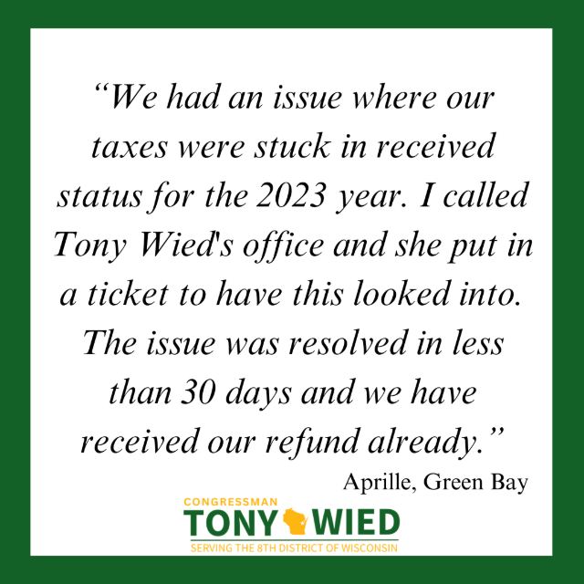 Providing the the best constituent services to the people of Wisconsin’s 8th Congressional District is a top priority for me, from Veterans Affairs (VA) to the Internal Revenue Service (IRS), my staff and I are here to help! To request assistance with a Federal Agency, you can contact me District Office at 920-301-4500 or submit a message through my website here.