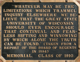 “WE BELIEVE THAT THE GREAT STATE UNIVERSITY OF WISCONSIN SHOULD EVER ENCOURAGE THAT CONTINUAL AND FEARLESS SIFTING AND WINNOWING BY WHICH ALONE THE TRUTH CAN BE FOUND” is cast in bronze on a memorial that has adorned the entrance to Bascom Hall, the Administration building at the University of Wisconsin–Madison, since 1915.